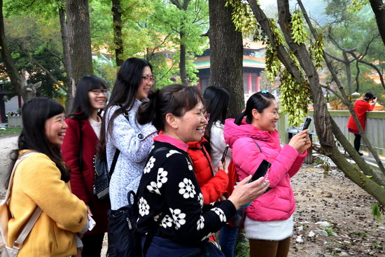 煙霧朦朦,綿綿的春雨為活動(dòng)增添了幾份雨趣。活動(dòng)的第一站是圭峰山國(guó)家森林公園,公園內(nèi)秀峰挺拔,林木蔥蘢,挺秀的圭峰、蜿蜒的云峰,交匯中擁出世外桃源般的綠護(hù)屏,大家三五成群,一邊欣賞春天的美景,一邊呼吸著大自然的清新空氣,在細(xì)雨籠罩下,盡情享受這情深深雨朦朦的意境。